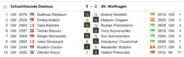 Für die weiteren vollen Punkte sorgten Rustem Dautov und Zdenko Kozul. Einzig Jules Moussard musste sich geschlagen geben.