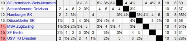 Wie man sieht, besteht eine Lücke von 4 Mannschaftspunkten zwischen Platz 13 und 14, die an diesem Wochenende aber egalisiert werden kann, wenn Zugzwang beide Kämpfe gewinnt, und sich nicht alle vier Mannschaften drüber nach oben absetzen. Nun gut – Deizisau ist auf jeden Fall im grünen Bereich, denn sie spielen auch noch gegen die Schwächeren, und werden hier wohl leicht punkten. Aber es gibt ein paar Mannschaften, die noch zittern müssen: Düsseldorf und der HSK 1830, die ein schweres Restprogramm haben, und vor allem Heimbach-Weis, obwohl sie momentan auf dem zehnten Platz stehen! Aber diese Letztrundengegner (unter anderem die Top 3) möchten wir nicht haben!