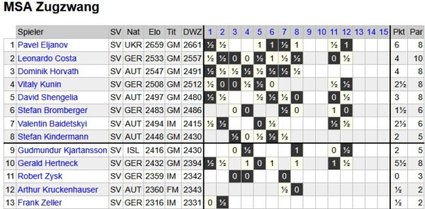 Auch der MSA Zugwang wurde in der laufenden Saison stark gerupft, und das obwohl er mit acht Großmeistern antreten konnte. Beste Spieler sind hier GM Pavel Eljanov, der gerade seinen zweiten Frühling hat, und der Verfasser GM Gerald Hertneck, der diese Saison wohl als seinen dritten oder vierten Frühling bezeichnen darf. Dass es nicht einfach ist, in der Bundesliga zu punkten, ist bekannt, dass es trotzdem geht, zeigt die Grafik auf. Auch Zugzwang setzt übrigens auch sechs deutsche Spieler ein, dazu kommt noch der Halb-Österreicher GM Stefan Kindermann, der seit über 60 Jahren in München wohnt.