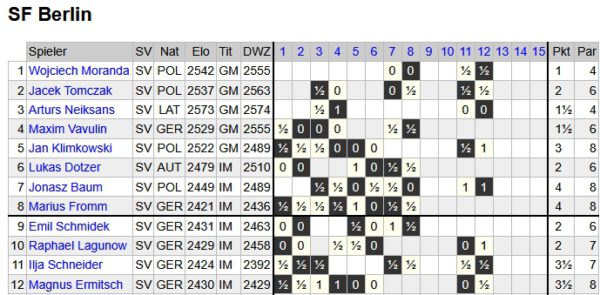 Traurig wird es allerdings, wenn man die Einzelergebnisse betrachtet – da hat kaum einer über 50%. Am solidesten war hier neben IM Marius Fromm der IM Ilja Schneider, der alle Partien remisierte, dabei ist er doch eigentlich ein großer Kämpfer. Doch auch die Berliner haben wirklich sehr viele Partien verloren, was ihre Lage kritisch macht.