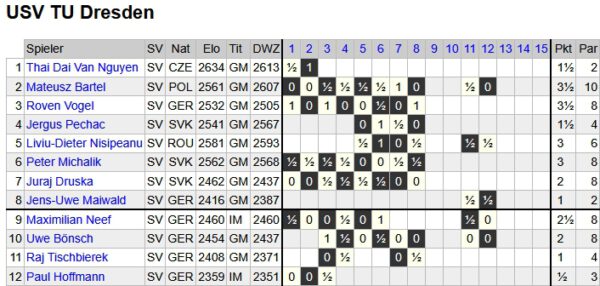 Die Dresdner sind wohl die letzte verbliebene ostdeutsche Mannschaft in der Liga. Hier spielen noch die Altmeister GM Uwe Bönsch und GM Raj Tischbierek, wenn auch an den hinteren Brettern. Immerhin bieten sie sechs Deutsche im Team auf, was keineswegs selbstverständlich ist. Allerdings hat dieses Team sehr viele Eier gelegt.