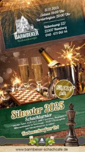 20 Uhr – Turniersimultan – Jeder gegen Jeden gleichzeitig, 1 Gruppe mit 11 Teilnehmern, 2 Gruppen mit 9 Teilnehmern, UNBEDINGT VORANMELDEN