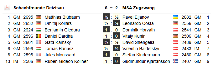 Gegen MSA Zugzwang gelang ein 6:2-Sieg. Am Spitzenbrett remisierte unser WM-Kandidat Matthias Blübaum gegen den stärksten Ukrainer Pavel Eljanov. Weitere halbe Punkte steuerten Kollars, Kamsky und Banusz bei. Für volle Punkte sorgten Gledura, Dardha, Moussard und Köllner.