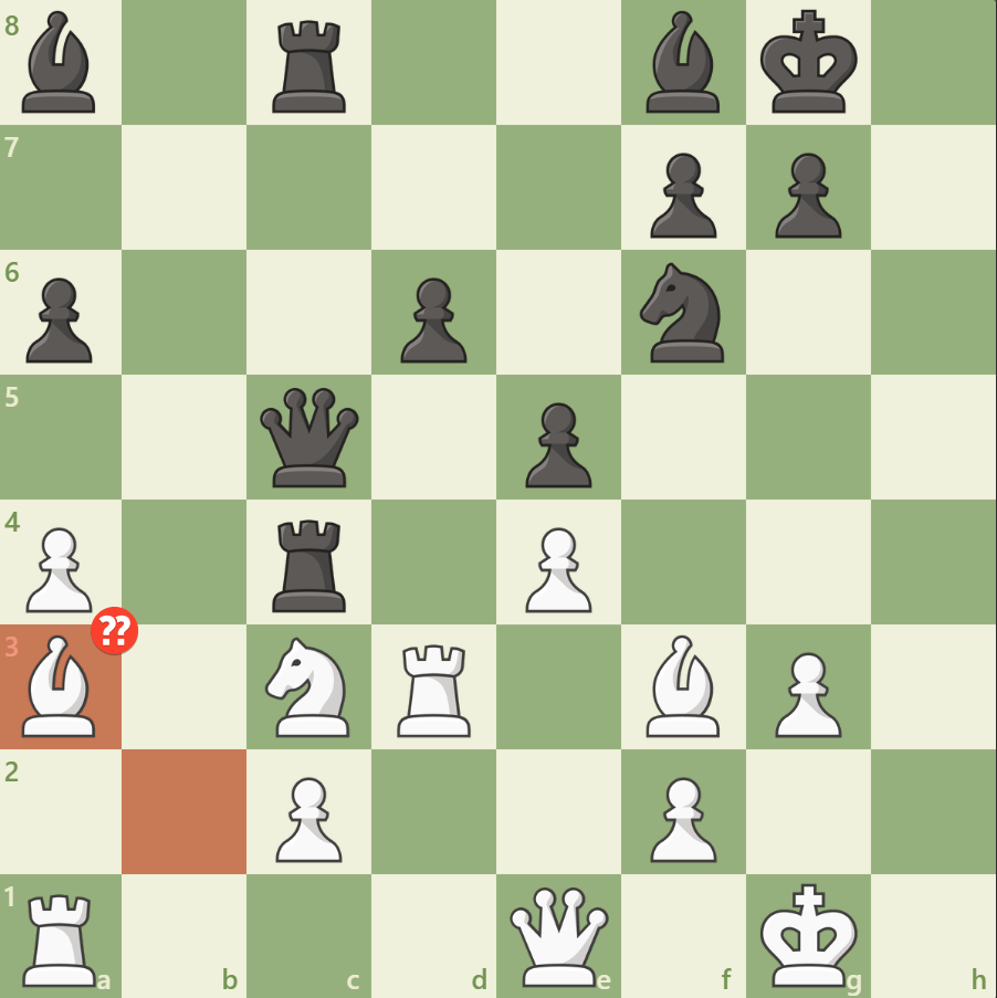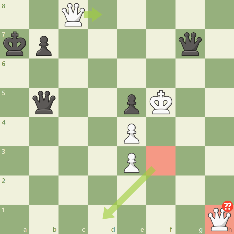 Der Ungar Gledura spielte gegen den Österreicher Horvath eine wilde Partie mit einem Endspiel mit vier Damen. Die zwei in grün eingezeichneten Züge wären für Weiß die einzigen erfolgversprechenden gewesen. Doch nach 43. Dh1?? folgten … Df7+ 44. Kg5 De7+ 45. Kf5 Da6 46. Dhh8 Df1+ 0-1. Ein erfolgreicher Start in das Bundesliga-Wochenende.