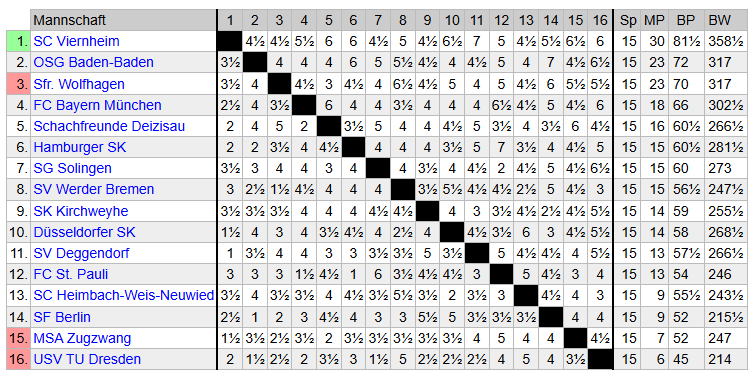 MSA Zugzwang München und der langjährige Bundesligist USV TU Dresden müssen den Gang in die zweite Bundesliga antreten. Die Schachfreunde Wolfhagen haben bereits im Vorfeld ihren Rückzug angekündigt. Aus der zweiten Liga rücken planmäßig der SC Remagen Sinzig und die Schachfreunde Bad Mergentheim nach. Die genaue Zusammensetzung der Liga wird noch bekanntgegeben.