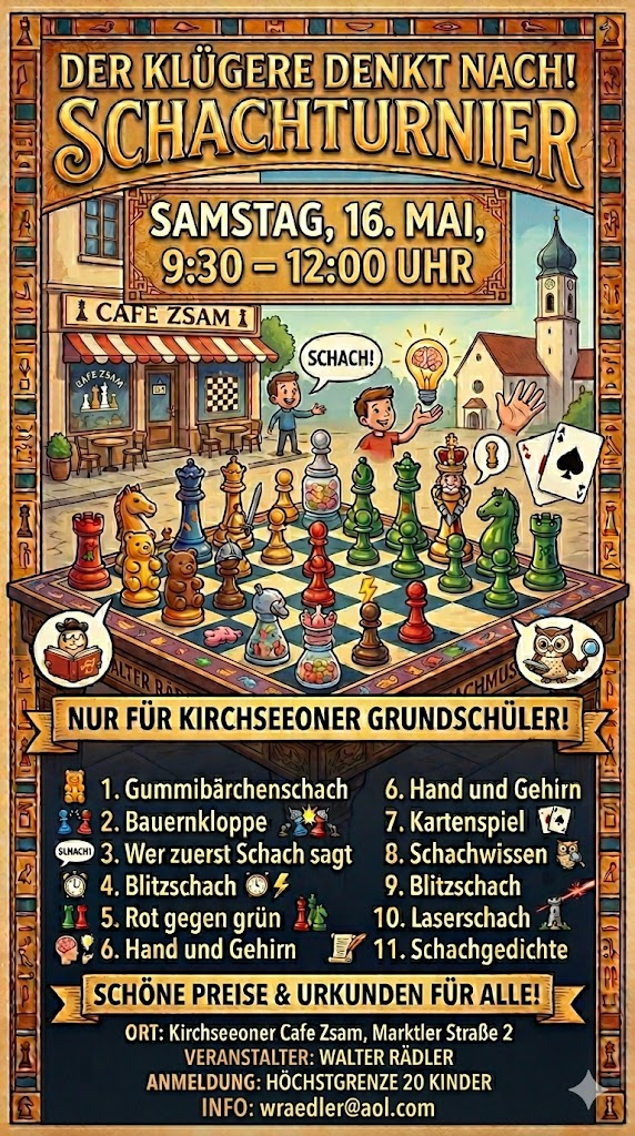 Hallo, ich mache bei mir im Ort mal wieder ein Schachturnier, natürlich nur für die Kinder vom Ort.