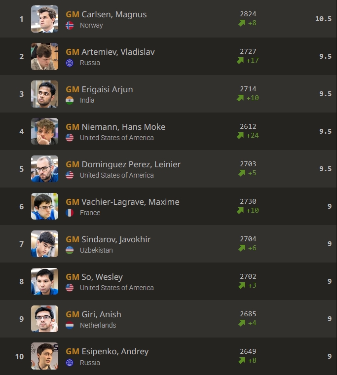 Schaut man sich die Top-Platzierten näher an, stellt man fest, dass mit GM Sindarov und GM Giri auch zwei Kandidaten darunter sind, aber eben nur zwei!
