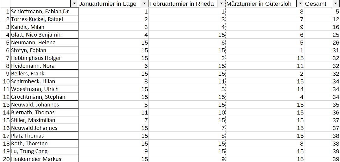 Erstmals in 2026 wird im Rahmen der Turnierserie eine Gesamtwertung (Preisfonds 525€) ausgespielt. In dieser führt Fabian Schlottmann, der die ersten beiden Turniere des Jahres gewinnen konnte, vor FM Rafael Torres-Kuckel und FM Milan Kandic. Nico Glatt und WFM Helena Neumann haben durch eine starke Leistung in Gütersloh einige Plätze gut gemacht und liegen damit derzeit auf den Preisrängen.