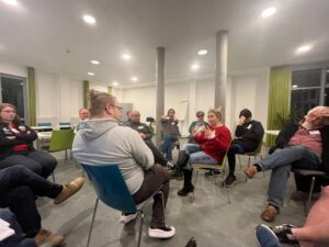 Der Abend begann mit einer tricky Diskussionsveranstaltung. In der Mitte waren drei Stühle und die drei durften miteinander diskutieren. Wenn einer in die Mitte gehen wollte, war es ihm jederzeit möglich, die Diskutierenden konnten jederzeit einen von außen in die Mitte holen und das Forum verlassen. Dieses Verfahren ermöglichte mir eine sehr schöne Diskussionsveranstaltung über das Thema „Krisenkommunikation – Wie reagieren auf rechte Kommentare im Netz?“