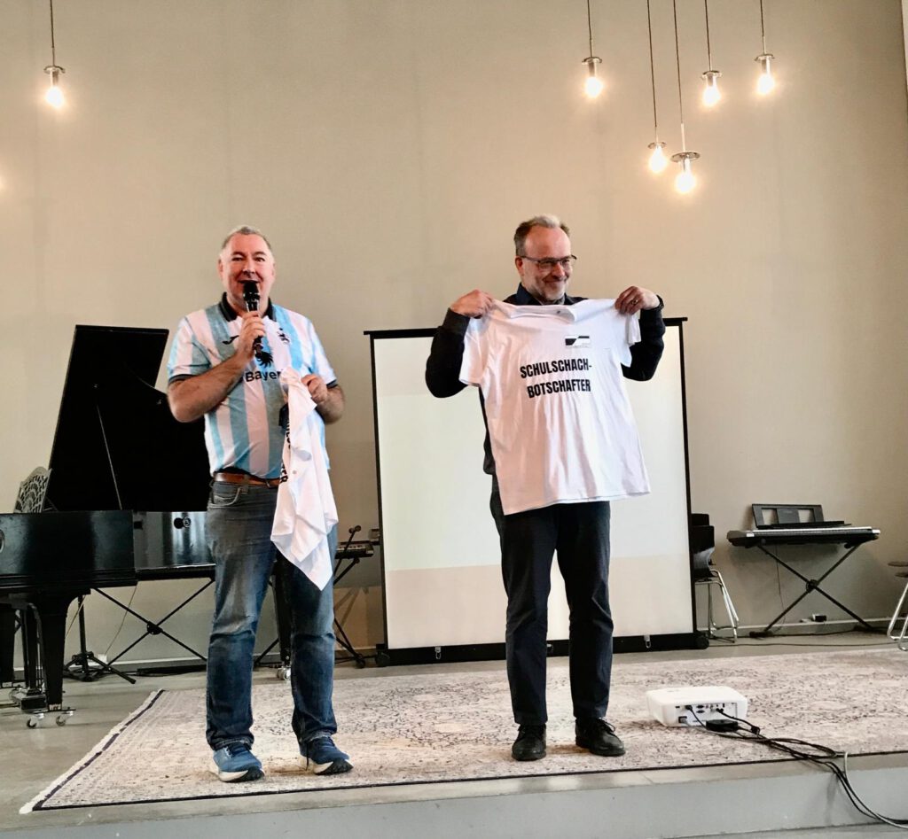 Ich habe zwei Kongressgeschenke, wunderschöne Botschafter-T-shirts und zwei schöne Schachbücher, von Joyce Simon der Schachticker und Laura Schalkhäuser und Harald Schneider-Zinners Schach-Abenteuer.