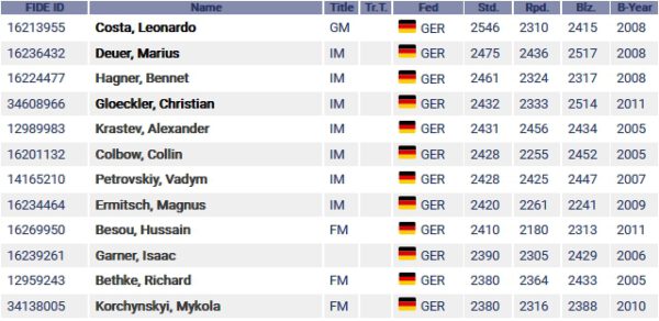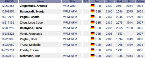 Nicht gut sieht es dagegen bei unseren Nachwuchsspielerinnen aus, man muss es leider immer wieder betonen! Denn Antonia Ziegenfuß – eine sehr talenierte Spielerin – ist die einzige über Elo 2200, aber sie studiert Medizin in Hamburg und spielt nicht mehr allzu viel, sie hat die Akzente anders gesetzt, was man ihr nicht verübeln kann.
