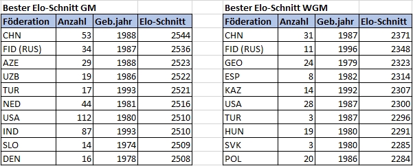 Zum Abschluss noch Durschnitt-Elo und Durchschnittsalter weltweit.