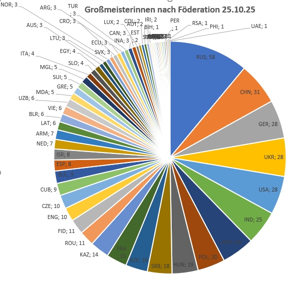 Und bei den Frauengroßmeisterinnen analog? Auch hier führt Russland vor China! Doch auch Deutschland kann sich mit Platz 3 (geteilt mit der Ukraine und den USA) sehen lassen.