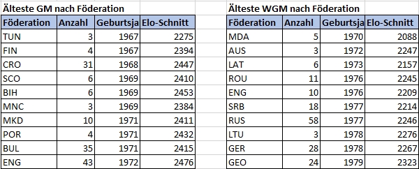 Eher aussagekräftig ist dann wohl wieder die Rubrik „Älteste GMs nach Föderation“. England und Koratien (die auch im Vergleich zu den serbischen Nachbarn) haben kaum „Nachwuchs“. Und die meisten deutschen WGMs sind „nicht mehr jung“. Das gilt auch für Georgien wo relativ viele bekannte Namen aus der Vergangenheit die Statistik beeinflussen (Chiburdanidze, Gaprindashvili, Ioseliani, Alexandria). Dass Deutschland bei den Männern in dieser Tabelle nicht vertreten ist liegt sicher nicht nur an der jungen Nationalmannschaft – das sind ja nur (mit einem, der jeweils außen vor bleiben muss) 6 von 102 GMs.