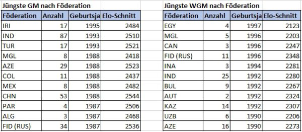 Verteilung der insgesamt 49 GMs Jahrgang 2005 und jünger: 13 aus Indien, 7 aus den USA, 5 FIDE/Russland, doppelt vertreten noch Türkei, Iran, Polen, Usbekistan und China, und 13 Länder mit einem so jungen GM.