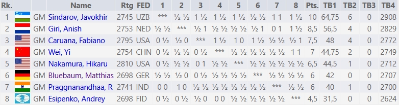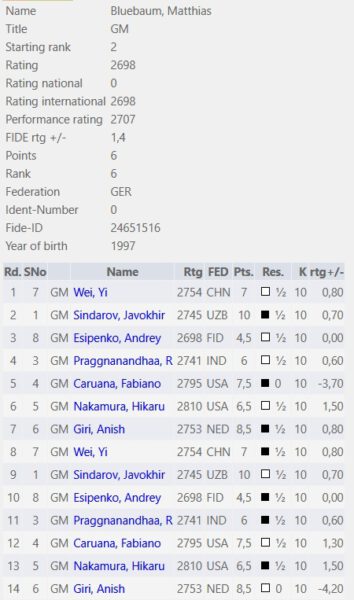 Zunächst zur Einordnung: Mit einer Elo von knapp 2700 war Blübaum nominell der schwächste Spieler des Felds (zusammen mit Esipenko), und seine Teilnahme kam für viele überraschend. Angesichts dessen ist das Ergebnis durchaus respektabel. In diesem starken Feld hätte es auch ganz anders laufen können, doch er hielt stand!