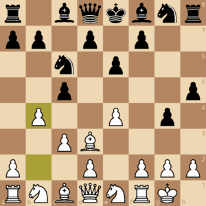Was ist das denn? Freestyle-Chess jedenfalls nicht, die zahlreichen nicht entwickelten Figuren stehen ja auf den „richtigen“ Feldern. Etwa ein ungewöhnliches Abspiel der Orang-Utan Eröffnung (1.b4)? Nein, es begann mit 1.e4 c5 2.Sf3 e6 3.Ld3!? (das gibt es auch) 3.-Sc6 4.0-0 g5!? (von Engines empfohlen und bekannt) 5.c3 g4 6.Se1 h5 7.b4!? – offenbar neu aber in ähnlichen anti-sizilianischen Stellungen einigermaßen bekannt.