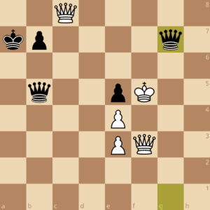 Warum das ein ungewöhnliches Damenendspiel ist muss ich wohl nicht erklären. Vier Damen sieht man nicht alle Tage (oder Wochen oder Monate oder auch Jahre). Nun kam 43.Dh1?? „Dame in der Ecke bringt den eigenen König zur Strecke“ 43.-Df7+ 44.Kg5 De7+ 45.Kf5 Da6! „ohrenbetäubend still“ 46.Dhh8 die andere Ecke, deckt Feld f6 aber 46.-Df1+ 0-1.