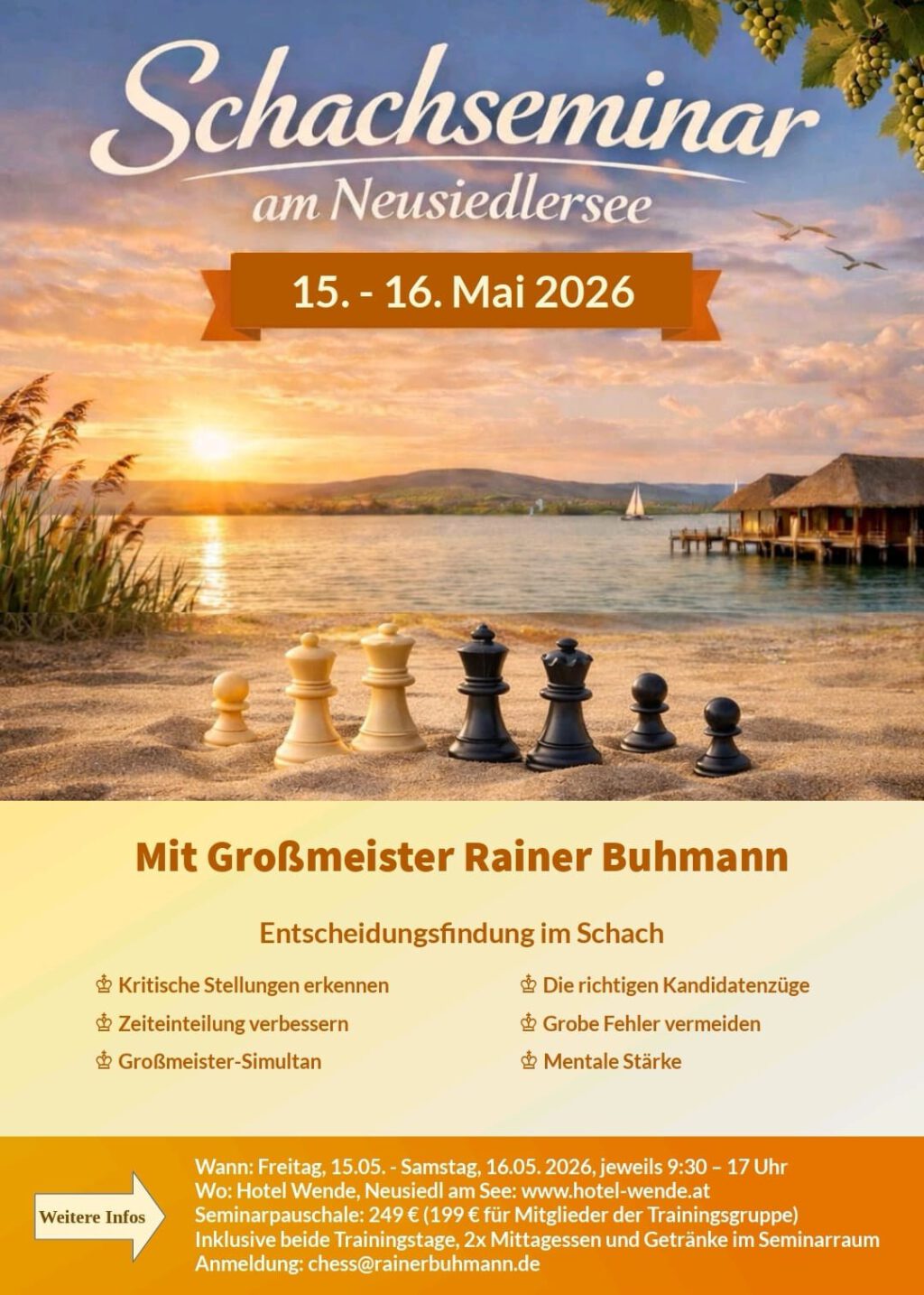 Rädler Fortbildung mit GM Rainer Buhmann im Mai in Österreich Walter Rädler 19.01.2026 1 min. gelesen ich habe von ihm sehr viel gutes von ihm gehört, deswegen ist das Seminar absolut empfehlenswert, auch wenn ich keine direkte Erfahrungen mit GM Rainer Buhmann habe. teilen teilen teilen teilen teilen teilen E-Mail Beitragsnavigation Zurück Vorschau auf das Münchener Schachfestival 2026 Schreibe einen Kommentar Antwort abbrechenDeine E-Mail-Adresse wird nicht veröffentlicht. Erforderliche Felder sind mit * markiertKommentar * Name * E-Mail-Adresse * Meinen Namen, meine E-Mail-Adresse und meine Website in diesem Browser für die nächste Kommentierung speichern. Verwandte Geschichten Trainiere mit IM Roman Vidonyak vom 17. Januar 2026 1 min. gelesen Rädler Trainiere mit IM Roman Vidonyak vom 17. Januar 2026 17.01.2026 Simon der Schachspieler jetzt auch in deutscher Sprache 1 min. gelesen Rädler Simon der Schachspieler jetzt auch in deutscher Sprache 17.01.2026 Konferenz chess and education in München 1 min. gelesen Rädler Konferenz chess and education in München 17.01.2026 2