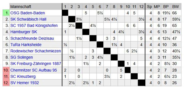 In der zweiten Doppelrunde der Frauenbundesliga waren die Teams aus Rodewisch und Bad Königshofen zu Gast in Schwäbisch Hall. Und den Zuschauern wurde einiges geboten. In allen Partien wurde mit offenem Visier gekämpft, es kam zu einer Vielzahl extrem spannender Partien. Am Samstag gewann Schwäbisch Hall 5,5-0,5 gegen Rodewisch, Bad Königshofen schlug Deizisau mit 4,5-1,5. Spannend wurde es am Sonntag. Nach einem wahren Krimi schlug Schwäbisch Hall den deutschen Meister Bad Königshofen mit 3,5-2,5 und bleibt gemeinsam mit Baden-Baden verlustpunktfrei. Im Parallelspiel trennten sich Deizisau und Rodewisch 3-3, hier ließ Rodewisch einige Chancen für einen Sieg aus. Die Entscheidung für Schwäbisch Hall fiel in der Partie zwischen Irina Bulmaga und Anastasia Savina, als Bulmaga zunächst haushoch auf Gewinn stand, dann aber anstatt ihren König in Sicherheit zu bringen, eine Springergabel übersah, die eine glatte Dame kostete. Das entstandene Endspiel war aber alles andere als trivial, und Bulmaga gewann die eigentlich ausgeglichen stehende Partie quasi noch ein zweites Mal. Den Sieg perfekt machte Lela Javakhishvili gegen Jana Schneider. Für Bad Königshofen gewann Aleksandra Maltsevskaya gegen Meri Arabidze. Ebenfalls verlustpunktfrei ist Baden-Baden mit Siegen gegen Chemnitz und Kreuzberg. Gegen Chemnitz gingen aber gleich die beiden ersten beiden durch Elisabeth Pähtz und Mai Narva besetzten Bretter verloren. Spannung verspricht der Abstiegskampf. Ohne Punkt ist nur noch Hemer, die drei Aufsteiger aus Chemnitz, Kreuzberg und Freiburg haben alle schon einmal gewonnen. Hamburg ist nach zwei Siegen gegen Solingen und Hemer neben Bad Königshofen erster Verfolger des Spitzenduos, das im März in Freiburg direkt aufeinandertrifft. Weiter geht die Saison am 21. und 22. Februar 2026, dann wird in Chemnitz, Rodewisch und Baden-Baden gespielt. Am interessantesten ist sicherlich das Aufeinandertreffen von Bad Königshofen und Hamburg. Schwäbisch Hall ist in Chemnitz gegen die Gastgeberinnen und Kreuzberg haushoher Favorit, aber in Runde 2 hat man gegen Hemer ja schon gesehen, dass es auch gegen die Underdogs nicht immer einfach ist.