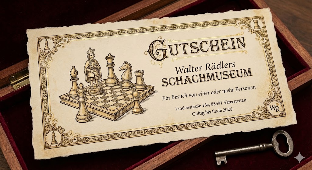 Rädler Gutschein für Walter Rädlers Museum Walter Rädler 06.01.2026 1 min. gelesen Wenn jemand nach München kommt, kann er anfragen, wann das Museum offen ist und einen Termin ausmachen. wr******@*ol.com ist meine E-Mailadresse, ich antworte relativ schnell. teilen teilen teilen teilen teilen teilen E-Mail Beitragsnavigation Zurück ECU-Schulschachpatentkurs ONLINE mit Lothar Handrich 20.-22.2.2026 – ein halbes Jahr Chesss Kid Gold membershhip für alle deine Schüler !!!!Weiter DAS IST SO GEIL! chessmint – Mit Miniaufwand sehr schöne Arbeitsblätter erfinden! Schreibe einen Kommentar Antwort abbrechenDeine E-Mail-Adresse wird nicht veröffentlicht. Erforderliche Felder sind mit * markiertKommentar * Name * E-Mail-Adresse * Meinen Namen, meine E-Mail-Adresse und meine Website in diesem Browser für die nächste Kommentierung speichern. Verwandte Geschichten DAS IST SO GEIL! chessmint – Mit Miniaufwand sehr schöne Arbeitsblätter erfinden! 5 min. gelesen Rädler DAS IST SO GEIL! chessmint – Mit Miniaufwand sehr schöne Arbeitsblätter erfinden! 06.01.2026 ECU-Schulschachpatentkurs ONLINE mit Lothar Handrich 20.-22.2.2026 – ein halbes Jahr Chesss Kid Gold membershhip für alle deine Schüler !!!! 3 min. gelesen Rädler ECU-Schulschachpatentkurs ONLINE mit Lothar Handrich 20.-22.2.2026 – ein halbes Jahr Chesss Kid Gold membershhip für alle deine Schüler !!!! 05.01.2026 Alle Projekte von Dr. Edmund Bruns unter einem Dach 1 min. gelesen Rädler Alle Projekte von Dr. Edmund Bruns unter einem Dach 05.01.2026