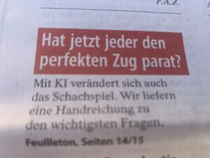 Jürgen Kaube, einer der Herausgeber und selbst ein guter Spieler, hat den Aufmacher geschrieben. Paul Ingenday, lange Spanien-Korrespondent, outet seine (überstandene) Onlineschachsucht. Der Philosophieprofessor Markus Gabriel steuert einen Essay bei. Von mir kommt ein Beitrag darüber, wie Schach seinen KI-Schock längst überstanden hat und was drei deutsche Firmen im Bereich Schach und KI leisten. Der hängt im Text an. Als Anhang meine Schachkolumne, die den Schlenker nach Karlsruhe macht.