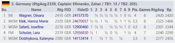 Weiter in Text. FM Lara Schulze fiel dagegen etwas ab: gestartet mit Elo 2319 erzielte sie eine Performance von 2290 gegen einen Schnitt von 2240. Das ist noch im grünen Bereich, aber das schwächste Einzelresultat der Mannschaft. Hier hätte man noch einen Sieg mehr erwarten können.
