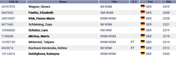 Nun, das sind nicht viele! 12 Spielerinnen über Elo 2200, wobei WIM Sonia Maria Bluhm nicht aktiv ist (überwiegend inaktiv seit 2019; sie ist tätig als Schachstreamerin) genau wie WGM Osmanodja Filiz (inaktiv seit 2020, sie arbeitet als Ärztin) und WGM Melanie Lubbe (inaktiv seit 2025; sie hat überraschend erklärt, eine Schachpause einzulegen). übrig bleiben also 9 plus Kateryna, die schon etwas älter ist.