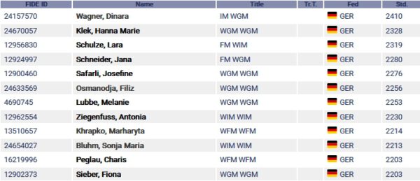 Jana Schneider ist in der ersten Liste enthalten, und steht dort auf Platz 4. Olga Babyi fiel interessanterweise aus beiden Listen raus, weil sie unter 2300 liegt und 1989 geboren statt ab 1990. Trotzdem danke für den Hinweis.