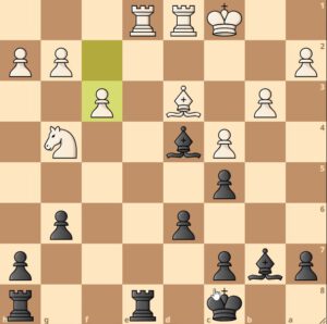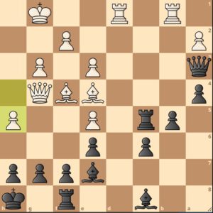 Dies war meine Stellung gegen Elif Yildiz aus der Türkei. Hier hat der weiße Springer auf g4 große Probleme, denn er hat gar keine Felder mehr zur Verfügung. Dies konnte ich mit h5 ausnutzen. Nach Txe8 Txe8 Lxg6 geht der Turm einfach zurück nach h8 und deckt wieder den Bauern auf h5. Nun lässt sich der Materialverlust für Weiß nicht vermeiden.