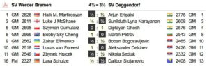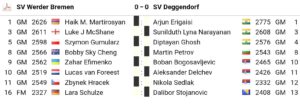 Am ersten Brett hielt unser Spieler Haik Martirosyan Remis gegen Arjun Erigaisi. Luke McShane, Zbyněk Hráček und mein Trainer und Bundestrainer Zahar Efimenko spielten ebenfalls Remis.