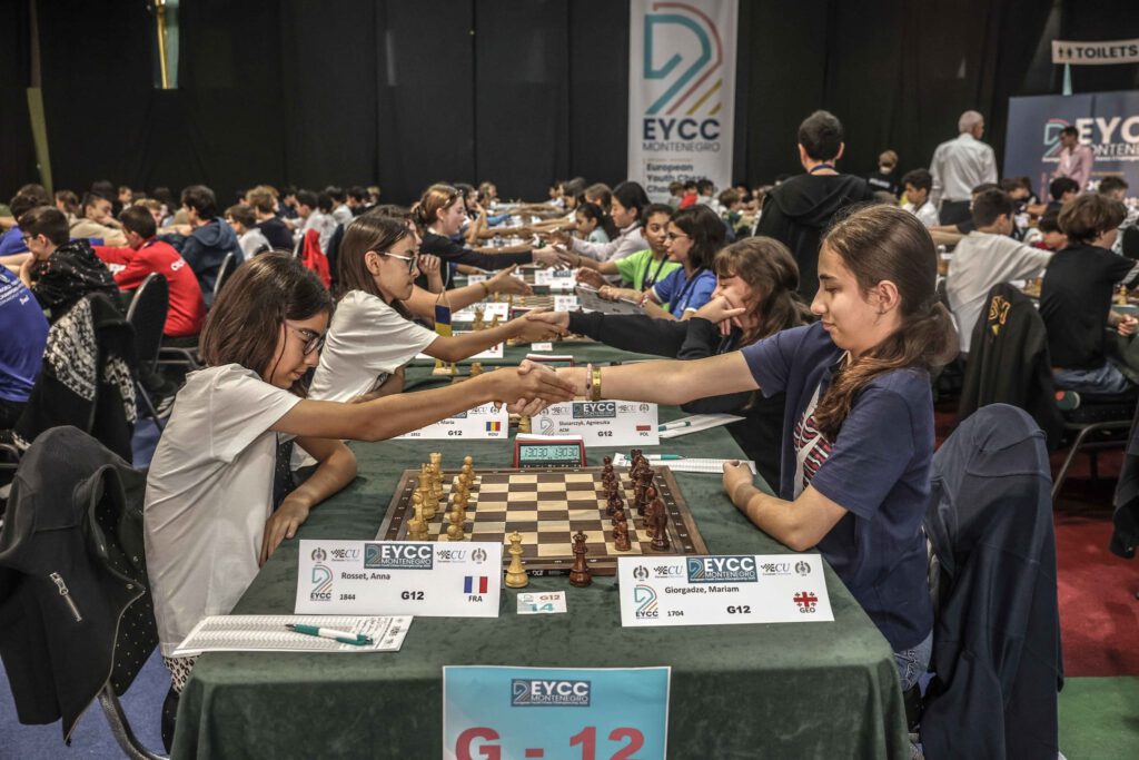 Der Spielsaal war ein Zeltkomplex, der direkt neben den Rohbau eines großen Hotels aufgebaut war. Bei der ersten Inspektion gab es ein paar Bedenken bezüglich Lärm von der Baustelle nebenan, abends wurde es auch schnell recht frisch und eine Heizung gab es nicht. Die Bedenken waren aber unbegründet, alles war gut organisiert. Das Turnier wurde in den Altersklassen U8-U18 gespielt, insgesamt gab es also 12 Turniere mit jeweils um die 100 Teilnehmern. Die Europäische Schachunion veranstaltet das alles zusammen, was den Stresslevel bei ca. 1200 Spielerinnen und Spielern für die Organisatoren mutmaßlich nochmal deutlich erhöht. Dagegen werden Weltmeisterschaften geteilt ausgetragen, einmal U8-U12 und U14-U18.