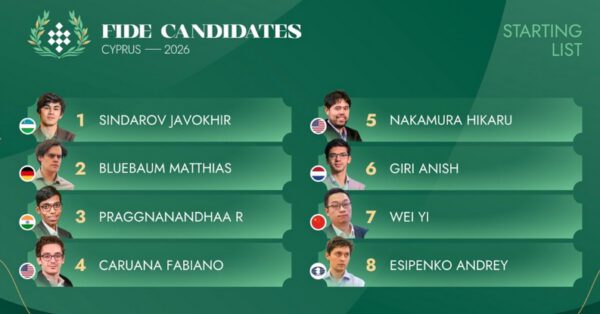 Ja, und damit sind natürlich auch die Paarungen _aller_ Runden bereits bekannt. Man findet sie auch bereits auf https://www.chess.com/events/2026-fide-candidates-open/games . Für Blübaum nach Weiß gegen Wei Yi Schwarz gegen Sindarov und Weiß gegen Esipenko – und (erst) dann die vier Gegner die sich weniger überraschend für das Kandidatenturnier qualifizierten.