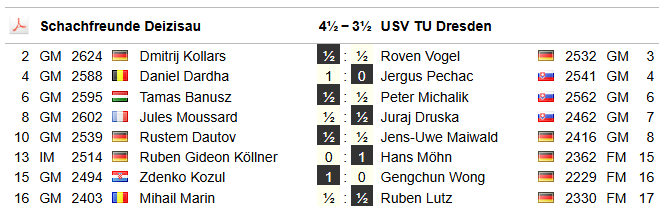 Auch Banusz, Moussard und Marin steuerten jeweils ein Remis bei. Die etwas überraschende Niederlage von Ruben Gideon Köllner gegen Hans Möhn fiel dadurch nicht entscheidend ins Gewicht.