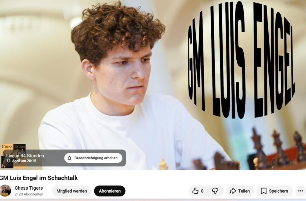 Ich freue mich auf den Sonntagstalk vom 12. April, der dann auf you tube zu verfolgen ist. GM Luis Engel im Schachtalk