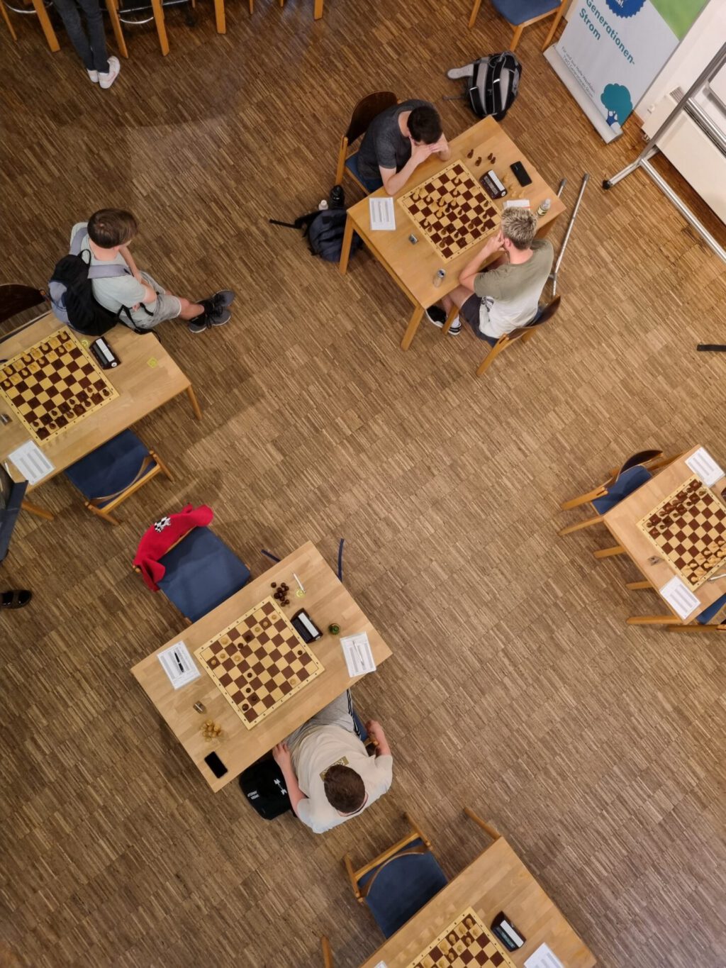 Gespielt wurde in der bekannten Haller Remise bei besten Bedingungen (Einzeltische, viel Platz) in 4er Gruppen. Jeder spielte gegen jeden jeweils eine Doppelrunde mit vertauschten Farben, insgesamt also 6 Partien. Die Bedenkzeit war 30 Minuten + 5 Sekunden, Zeit genug, um sich gründlich in die unbekannten Strukturen, die aus der Eröffnungsvorgabe resultierten, hineinzudenken. Das Teilnehmerfeld war ebenfalls auf erfreuliche Weise ungewöhnlich: 26 Teilnehmer spielten in den Gruppen A-F. Die Einteilung im Vorfeld war etwas schwierig, da 11 Spieler keine Wertungszahl besaßen. Es handelte sich dabei aber keineswegs um Anfänger. Einige hatten bisher einfach noch nie am offiziellen Schachturnierbetrieb teilgenommen oder sogar überhaupt noch nie eine Wettkampfpartie am Brett gespielt. Wir freuten uns ganz besonders, diese Teilnehmer bei uns begrüßen zu dürfen, denn auch wenn man Schach wunderbar im Internet spielen kann, ist man doch erst so richtig Teil der Schachfamilie, wenn man anderen Schachbegeisterten bei der Partie in die Augen schauen kann und mit ihnen bestenfalls die Partie im Anschluss auch noch besprechen kann.