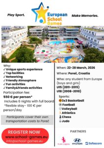It is with great pleasure that we invite your schools and chess players to take part in the European School Games 2026, a major international sports event for young students, which will be held in Poreč, Croatia, from March 22 to 28, 2026.
