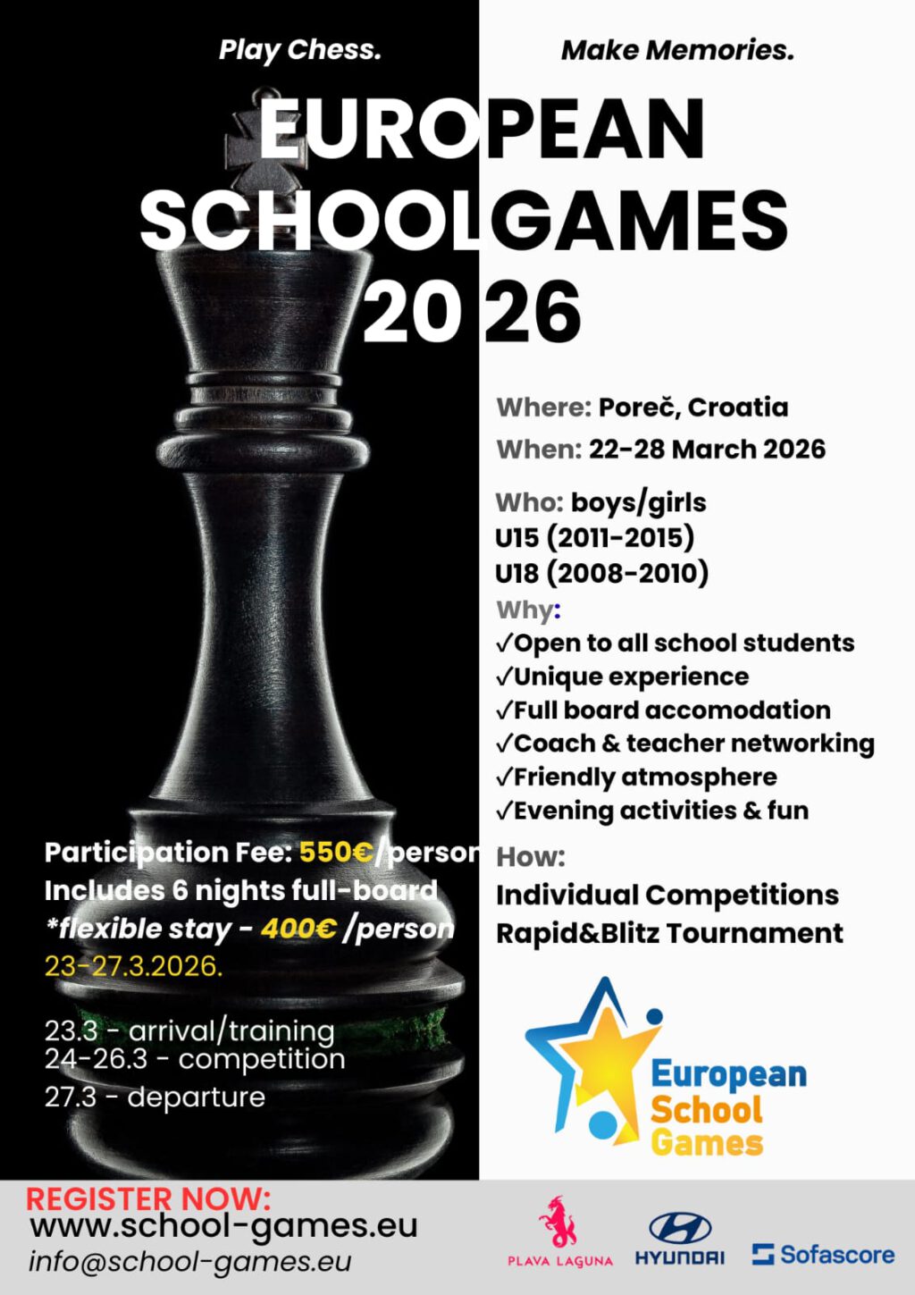 It is with great pleasure that we invite your schools and chess players to take part in the European School Games 2026, a major international sports event for young students, which will be held in Poreč, Croatia, from March 22 to 28, 2026.