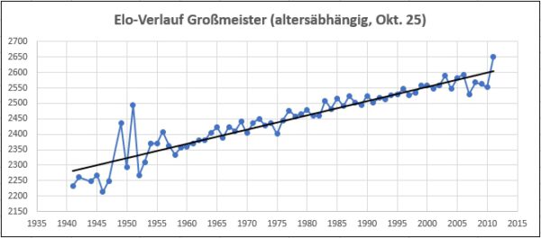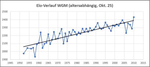 Des weiteren sind bei den Elozahlen die Durchschnittswerte des jeweiligen Jahrgangs angesetzt, womit die Spitzen nach oben und unten herausgemittelt wurden. Und im Anschluss daran wurde dann nochmals die Mittellinie (Trendlinie) gezogen.
