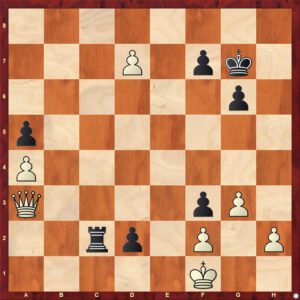 06) 1.Dxf3 Tc1 2.Dd1! TxDd1 3. Ke2 Tb1 4.d8 Dame d1 Dame+ 5. Dxd1 Txd1 6. Kxd1