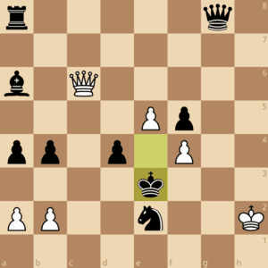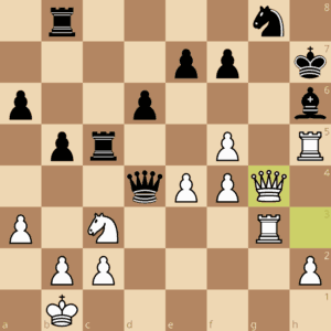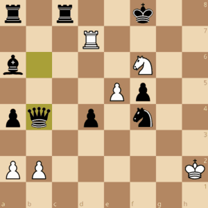 Schwarz hat hier noch größeren materiellen Vorteil und würde natürlich direkt gewinnen, wenn er denn am Zug wäre. Aber Weiß ist am Zug und hat Dauerschach – nicht mehr und nicht weniger, bzw. „mehr“ wenn der schwarze König freundlicherweise nach h8 läuft. Diese Variante mit direkt davor weißem Damenopfer kam aber nicht aufs Brett.