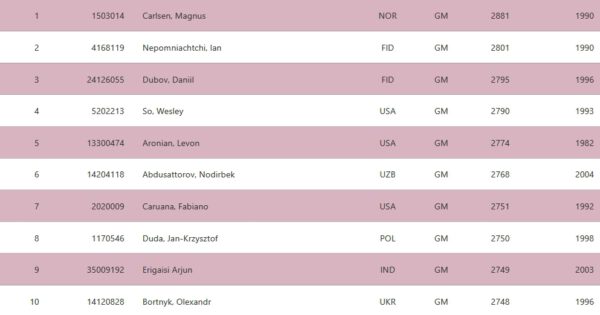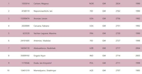 Das Teilnehmerfeld in allen Wettbewerben ist sehr prominent. Wir dachten erst: leider fehlt unsere Nummer 4, Vincent Keymer in allen Wettbewerben, doch dann stellten wir fest, er rangiert weiter unten, denn seine Schnellschach- und Blitzwertung kann nicht mit seiner Turnierwertung mithalten. Also startet er im Rapid auf Platz 36 mit 2640 Elo und im Blitz auf Rang 61 (!!) mit Elo 2599.