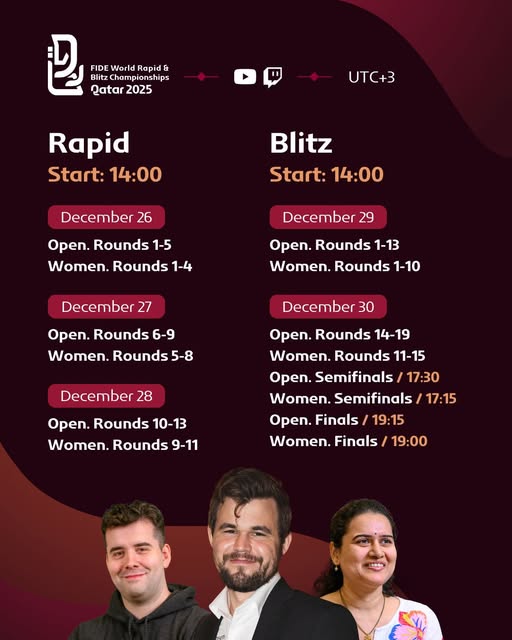 Nur noch 5 Tage dann ist es so weit: die Rapid- und Blitzweltmeisterschaften der Männer und der Frauen starten in Doha. War es letztes Jahr noch New York, so ist es heuer auf der arabischen Halbinsel, und zwar in Qatar!