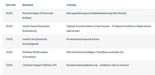 Eine Meldung auf der Homepage des des DSB ist zu entnehmen, dass die DSJ eine Vortragsreihe zur Betrugserkennung im Schach startet. Zitat: Die Deutsche Schachjugend lädt ab dem 26. Februar bis zum 23. April 2026 zu einer Online-Vortragsreihe mit Themen aus der Informationstechnologie (IT) ein. Das Premierenthema heute ist „Betrugserkennung und Spielerbewertung beim Schach“ und Redner wird kein Geringerer als Prof. Dr. Kenneth W. Regan von der Universität Buffalo (New York/USA) sein. Alle Vorträge erfolgen in deutscher Sprache und finden ab 19.30 Uhr am jeweiligen Veranstaltungstag statt. Die Vorträge werden mit dem Videokonferenzsystem BigBlueButton durchgeführt. Die Zugangsdaten werden wenige Stunden vor dem jeweiligen Vortrag per E-Mail an alle Angemeldeten gesendet.