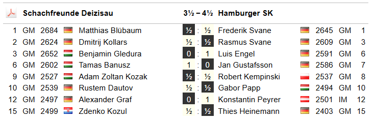 Doch erneut schlugen zwei Niederlagen zu Buche: Sowohl Benjamin Gledura als auch Alexander Graf mussten ihren Gegnern gratulieren. Die Duelle der Nationalspieler Matthias Blübaum und Dmitrij Kollars gegen die Svane-Brüder endeten jeweils nach hartem Kampf remis, sodass am Ende erneut eine knappe 3,5:4,5-Niederlage stand.